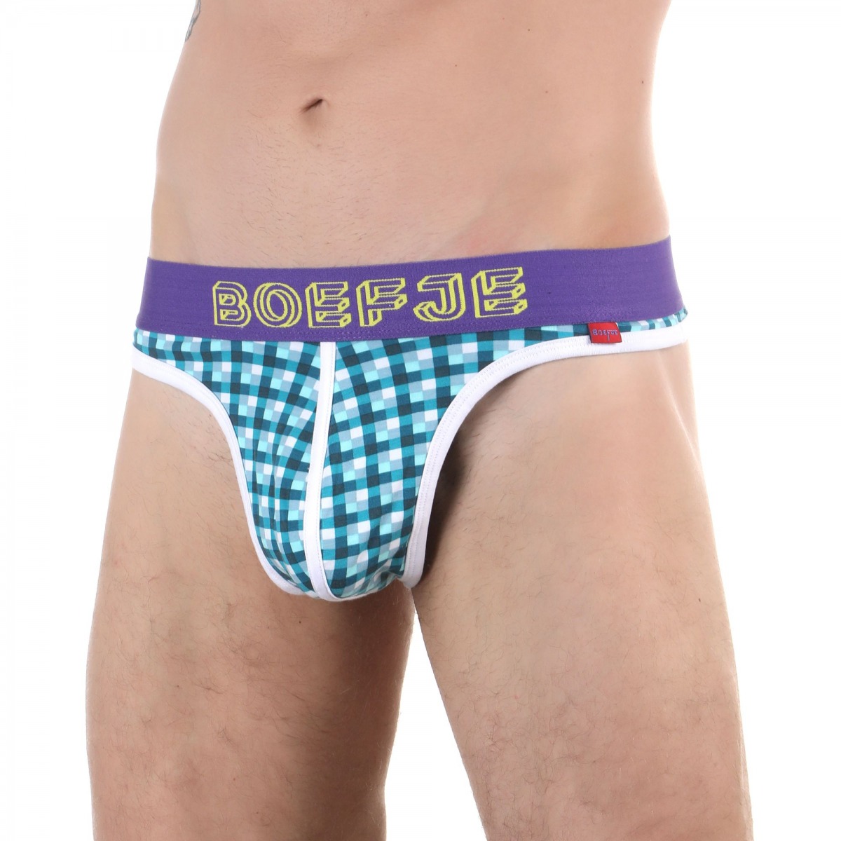 Бирюзовые клетчатые трусы-тонги с брендированным поясом.