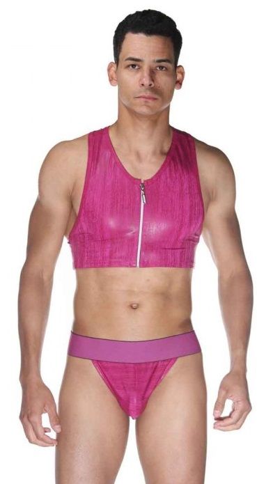 Комплект для мужчин, состоящий из топа на серебристой молнии, и трусов-тонгов на очень широкой резинке. Комплект из мягкой, гладкой и блестящей ткани. В комплекте: топ, трусы.