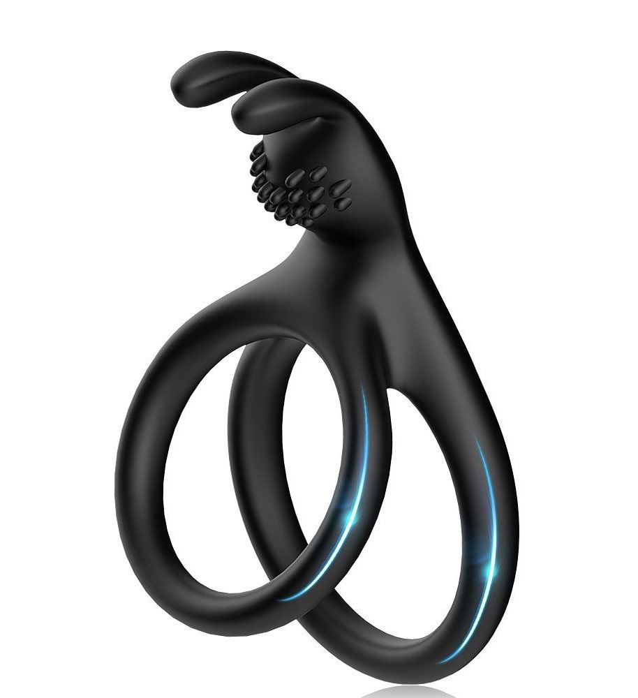 Эрекционное кольцо с дополнительным стимулятором клитора и дополнительным кольцом под мошонку. Внутренний диаметр колец - 3 и 3,6 см.