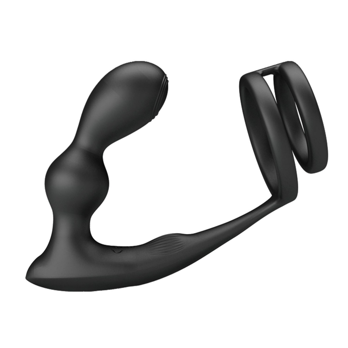 Черный вибростимулятор простаты с фиксацией кольцами. 12 режимов вибрации. Пульт дистанционного управления в комплекте. Рабочая длина - 7,5 см. Диаметр колец - 3,8 и 4,7 см.
