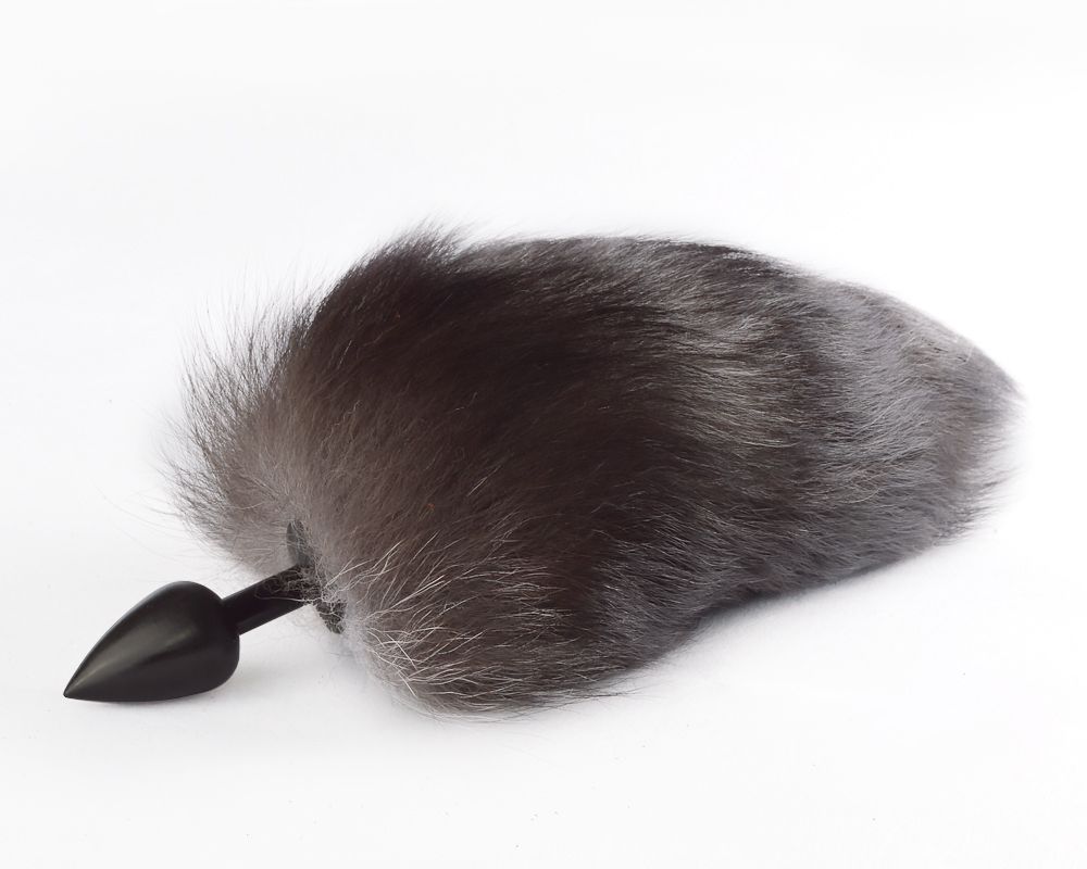 Черная анальная пробка из TPE с хвостом чернобурки (натуральный мех). Длина хвостика - 20-25 см.