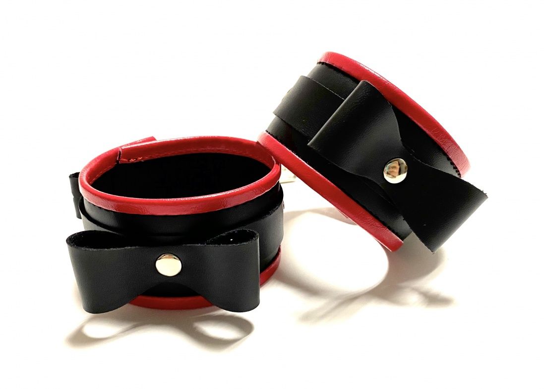 Красивые и функциональные наручники, выполненные из искусственной кожи. Декорированы металлической фурнитурой, лаковыми бантиками и красными вставками по краям. Обхват удобно регулируется с помощью пряжек. В комплекте идет соединение с карабинами. Очень экономичный, экологичный и практически незаменимый аксессуар для вашей любовной игры! Ширина - 4,5 см. Длина соединения - 11 см.
