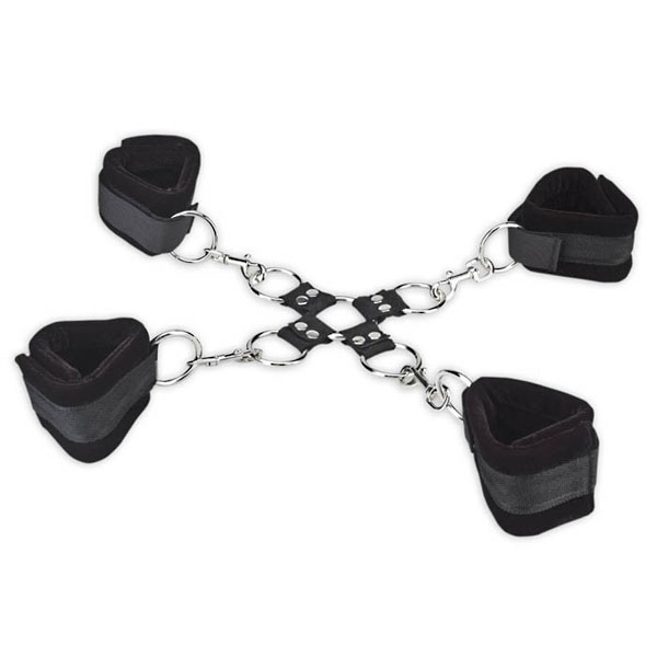 Комплект для сковывания из 5 предметов: 4 мягких браслетов на липучках с металлическими карабинами и соединительная часть с кольцами. Все браслеты можно использовать отдельно - как наручники или оковы для лодыжек, либо попарно соединять конечности. А соединительное звено поможет надежно и комфортно зафиксировать руки и ноги партнера одновременно. One size.