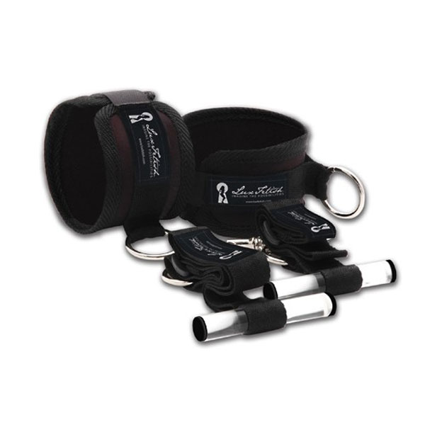 Черные наручники из мягкого поролона, размер регулируется на липучках. Манжеты можно использовать отдельно или вместе со стропами, которые можно закрепить на двери. Прозрачные цилиндрики перебрасываются через дверь, она закрывается и Ваш пленник вынужден держать руки вертикально.