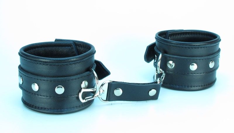 Оживить эротические игры Вам помогут наручники. Этот интимный аксессуар пользуется успехом у мужчин. Выполненные в черном цвете и украшены прочными ремешками. Модный интимный аксессуар не сдавливает и не нарушает кровообращение, так как изготовлен из мягкой кожи. Чтобы любимая никуда не убежала, наручники соединены короткой перемычкой. Длина манжет - 25,5 см., ширина - 5,7 см. Длина перемычки - 6 см.