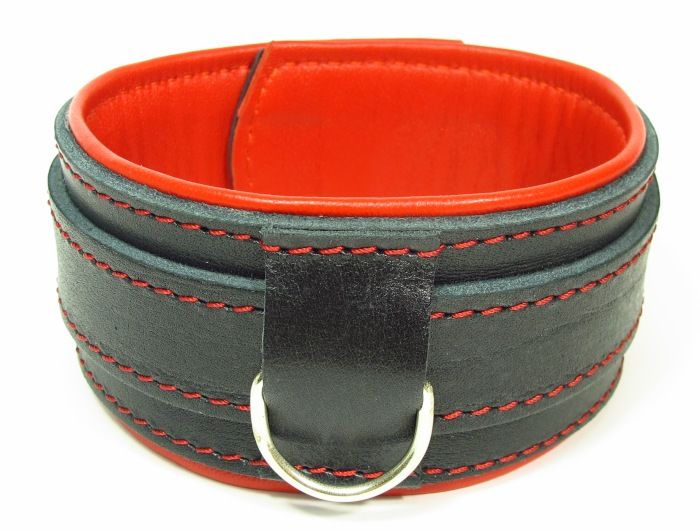 Ошейник с красным подкладом. Выполнен из толстой ременной кожи черного цвета, подклад мягкая перчаточная кожа ярко красного цвета. На пряжке. Использована усиленная металлическая фурнитура. Строчка толстой ниткой контрастного красного цвета.