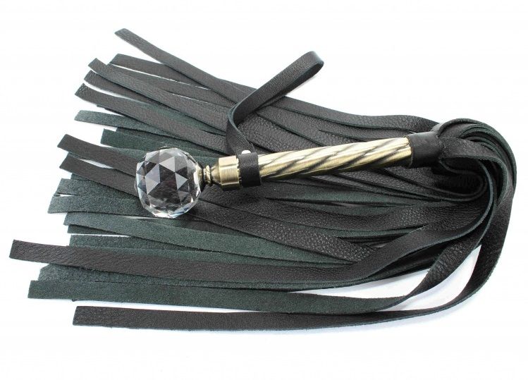 Плеть с широкими хлыстами и металлической ручкой. На конце ручки расположен крупный прозрачный кристалл.