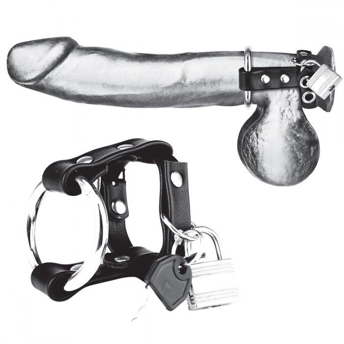 Заблокируй и сдави! Этот запираемый кожаный и металлический замок для члена предназначен для удержания эрекции, сжимает пенис и мошонку, удерживая член металлическим кольцом.