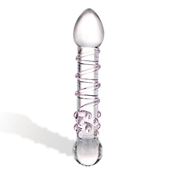Двухголовый короткий фаллос из прозрачного толстого стекла с большой объемной спиралью розового оттенка, у круглого конца тело фаллостимулятора покрыто большими выпуклыми массажными точками. Общая длина жезла: 18 см. Диаметр вытянутой головки: 3,5 см. Диаметр круглой головки: 3,7 см.