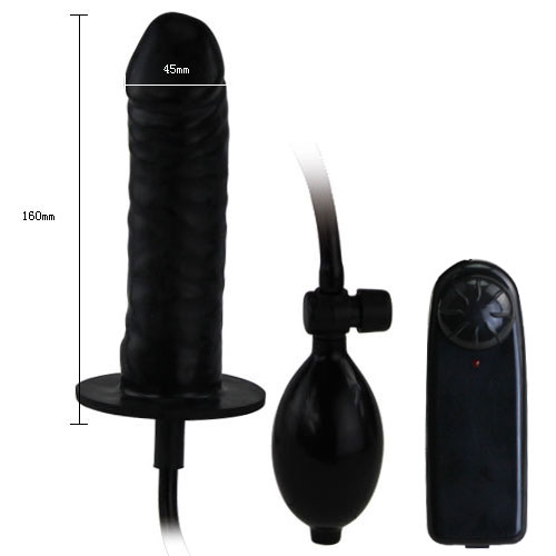 Вибратор черного цвета в упаковке. Имеет выносной пульт управления и грушу для накачивания.